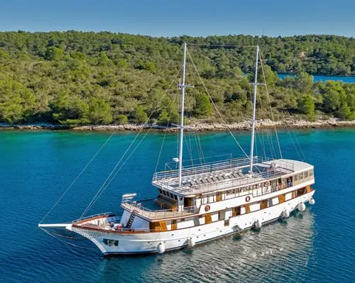 De Magellan, een dubbelmast motorjacht, biedt stabiliteit en comfort in open wateren. Gasten kunnen genieten van goed ingerichte hutten met airconditioning en een eigen badkamer. De salon en bar van het jacht, samen met een beschut achterdek, bieden gezellige plekken om te ontspannen. Het zonnedek nodigt uit tot ontspanning met zijn ruime ligstoelen, perfect om te koesteren in de zeelucht. Een zwemplatform aan het achterschip maakt moeiteloos zwemmen in zee mogelijk. Dineren aan boord is een genot met uitstekende maaltijden en een ruime keuze aan Kroatische wijnen.