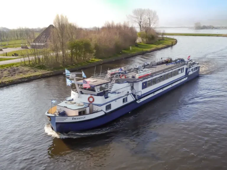 The Zwaantje, affectionately termed the ‘little swan’, is helmed by the seasoned Captain Martijn and his partner Marjorie. The lower deck houses 12 elegantly designed cabins: 10 twin and 2 doubles, each equipped with a private bathroom, a window (which opens only in the double cabins), and individual climate control. The main deck presents a comfortable lounge with expansive panoramic windows, ideal for a relaxing drink. Adjacent is the dining section, where guests are treated to a delightful breakfast and exquisite three-course dinners. On sunnier days, the sun deck beckons for some leisurely relaxation.